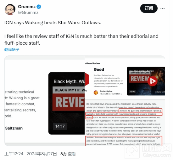 对此,暴雪前制作人 Grummz在社交媒体上发表了自己的看法:“IGN认为《悟空》比《星球大战:亡命之徒》更好。我觉得IGN的评测团队远比他们的编辑和软文团队更出色。”这一评论引发了游戏界的广泛讨论,特别是在IGN评分影响力巨大的背景下。