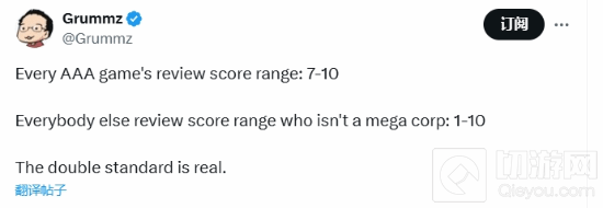 值得一提的是, Grummz还转发了一篇称育碧《碧海黑帆》的IGN评分也同样为7分的推文,表示IGN为3A游戏的评分范围是7分到10分,而在为一些非大型开发商的游戏进行评分时,评分范围就变成了1分到10分。“双重标准是存在的!”