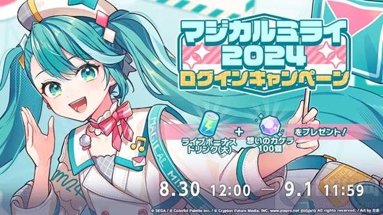 北京时间8月30日11时起,为纪念举办魔法未来2024活动,期间内登录游戏可获得「Live Bonus饮料(大)×1」和「心愿碎片×100」