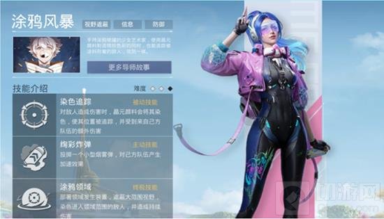 涂鸦风暴的被动技能“染色追踪”使得她在对敌人造成伤害时,晶元颜料会将敌人进行染色,使其位置被追踪,并受到来自己方队伍的额外伤害。在实战中,这项技能可以更加便捷准确地告诉队友敌人的位置,方便团队火力的指向和锁定,能够更快地淘汰发现的敌人。而涂鸦风暴的主动技能“绚彩炸弹”则允许她投掷出一个小型烟雾弹,对自己和队友产生加速效果。简而言之,绚彩炸弹不但具备普通烟雾弹遮蔽视野的作用,还可以提供加速,无论是在烟雾环境中的“混战”,还是转移时的机动性提升,都有着不错的效果。唯一需要注意的是绚彩炸弹的鲜艳色彩可能会过于显眼,会暴露己方位置并吸引敌人的注意;涂鸦风暴大约每20秒时间可以填充一枚绚彩炸弹,最多可以储备两枚。