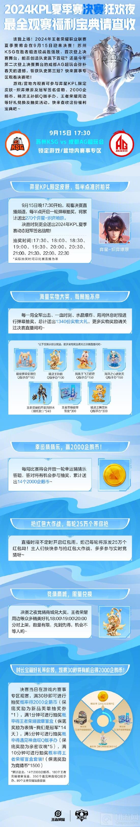 9月15日17:30,游戏内赛事专区和王者营地将开启夏季赛决赛狂欢夜,观众有机会获得多重好礼,包括KPL限定皮肤【弈星-炽弈燎原】和2024KPL夏季赛动态冠军签名信物。此外,每局比赛的关键时刻,如全军出击、一血爆发、水晶爆炸等,都会送出实物大奖,同时还有答题活动,答对有机会抽奖获得2000Q币。