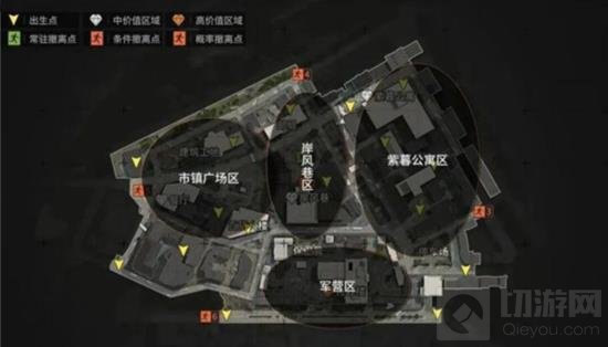 首先我们先来看看这张地图。可以看见,军港房屋与街道非常密集,交错衍生,是一张非常标准的巷战地图,我们可以用建筑群将地图大致分为四个区域:西北的市镇广场区,中间的岸风巷区,东部靠北的紫暮公寓区和南部独立成片的军营区。