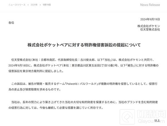 任天堂在诉讼中指出,《幻兽帕鲁》这款游戏侵犯了其多项专利,尽管具体专利内容未在公告中披露。任天堂表示,公司将采取必要措施保护其多年积累的宝贵知识产权,对于侵犯其品牌及知识产权的行为,将持续予以法律追究。具体的原文翻译如下: