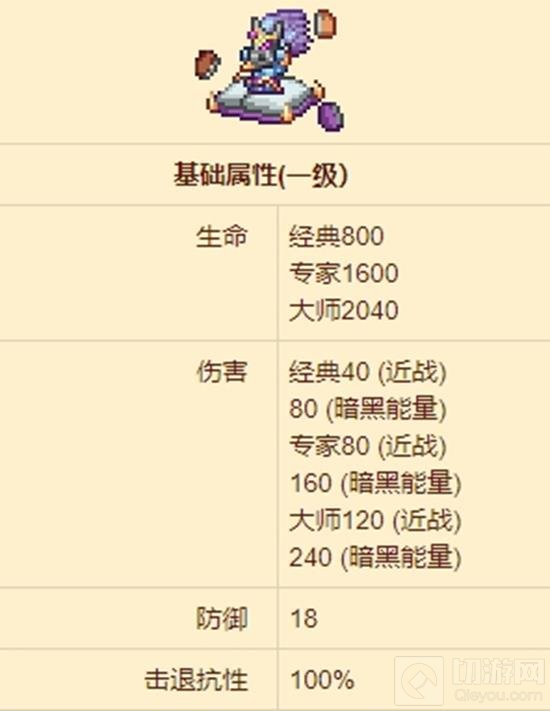 伤害:经典90(近战)/80(暗黑能量),专家180(近战)/160(暗黑能量),大师270(近战)/240(暗黑能量)