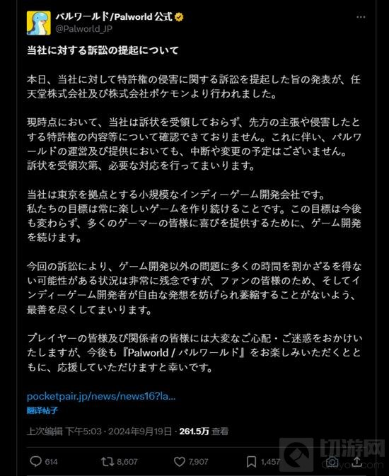 我们为此给各位玩家及相关人员带来的担忧与不便深表歉意,希望大家能继续享受并支持《幻兽帕鲁》。