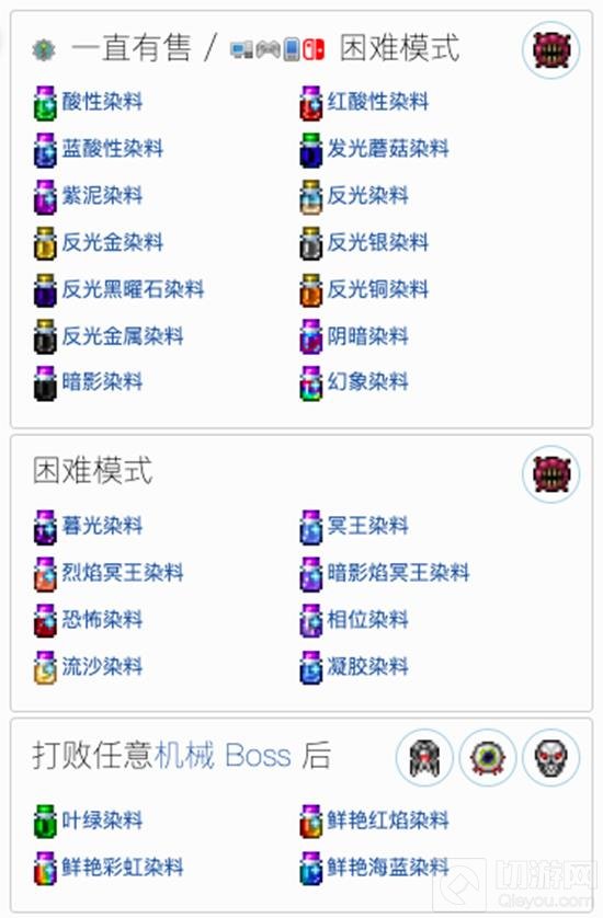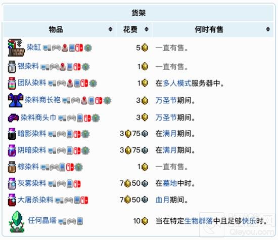染缸、银染料、团队染料(多人模式)、染料商长袍(万圣节期间)、染料商头巾(万圣节期间)、暗影染料(满月期间)、阴暗染料(满月期间)、棕染料、灰雾染料(墓地中时)、大屠杀染料(血月期间)、任何晶塔(在特定生物群系中且足够快乐时)。