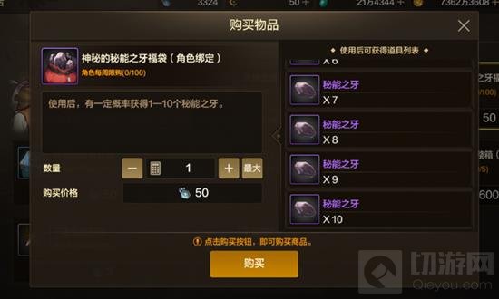 秘能之牙是宠物装备词条洗练的必备材料,不同于角色装备洗练所使用的宇宙精华和奇迹变换石,秘能之牙的获取途径相对有限。然而,通过决斗币,玩家可以在决斗商城中兑换神秘的秘能之牙福袋。每个福袋开出的秘能之牙数量在1到10个之间,每周可以兑换100个福袋,即每月最多可以兑换400个福袋。
