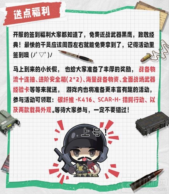 在福利方面,项目组宣布了“开服五天写封信聊昨天”活动,鼓励玩家积极参与。此外,官方还准备了一些奖励,包括战备物资十连抽、进阶安全箱(2*2)、海战战备物资、全面战场武器验证卡等,供玩家在游戏中获取。