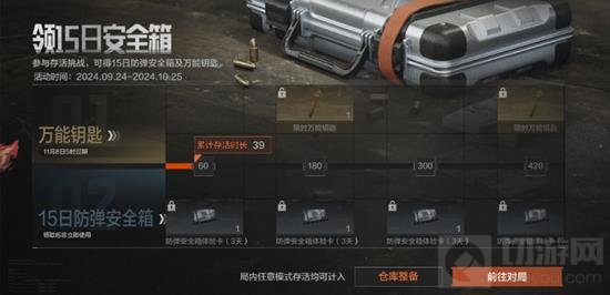 活动期间完成生存任务,存活达到指定时长即可领取限时万能钥匙和15日防弹安全箱体验卡,体验卡领取后先锋们可在礼包卡券界面自行选择使用时间、