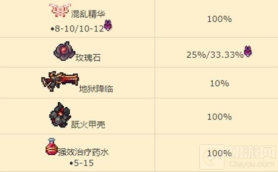 其他物品:包括玫瑰石、地狱降临、舐火甲壳、强效治疗药水、硫磺火元素面具、硫磺火元素纪念章等,每种物品都有不同的掉率。