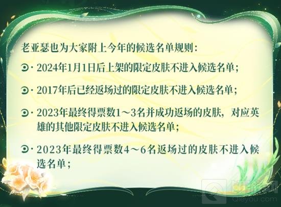从2023年开始,票选第1~3名并成功返场的皮肤,对应英雄的其他限定皮肤将不再进入次年候选名单。