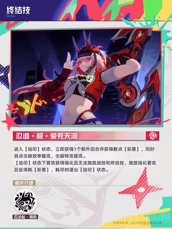 乱破的终结技会使乱破进入【结印】状态,获得一个额外回合并得到3点【彩墨】。在此状态下,乱破的弱点击破效率和击破特攻都将显著提高。在【结印】状态下,乱破只能使用强化后的普通攻击,并且每次使用都会消耗1点【彩墨】,直到【彩墨】耗尽为止。
