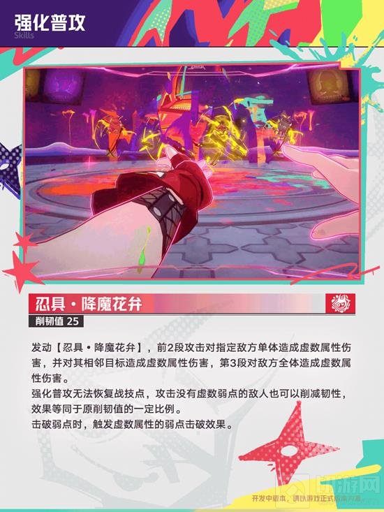 终结技启动后,乱破的普攻会被强化成忍具·降魔花弁。当发动忍具·降魔花弁时,前两段攻击会对指定敌方造成虚数属性伤害,而后续目标会受到稍少的虚数属性伤害。第三次攻击则是对敌方全体造成虚数属性伤害。该技能不仅具有多段攻击的特点,而且在击破敌人弱点时还能够触发额外的虚数属性弱点击破效果。