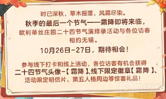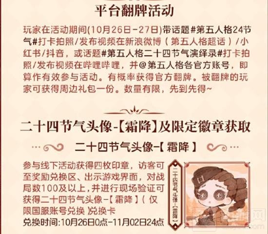 活动内容:参与现场活动,有机会获得二十四节气头像-霜降兑换卡、限量徽章、限定明信片和第五人格周边等奖励。