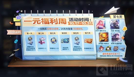 玩家只需1元购买10点券,即可开启7天登录好礼活动,登录7天还可随机获得皮肤、表情或积分夺宝抵用券。