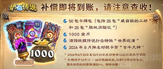 《炉石传说》玩家注意:丰厚补偿即将到账,登录即可领取!炉石传说官方昨日发布公告:补偿即将到账,请注意查收!「补偿将于 10月17-24 日陆续发放,收到时间会有先后,暂未收到的敬玩家请放心,稍安勿躁!