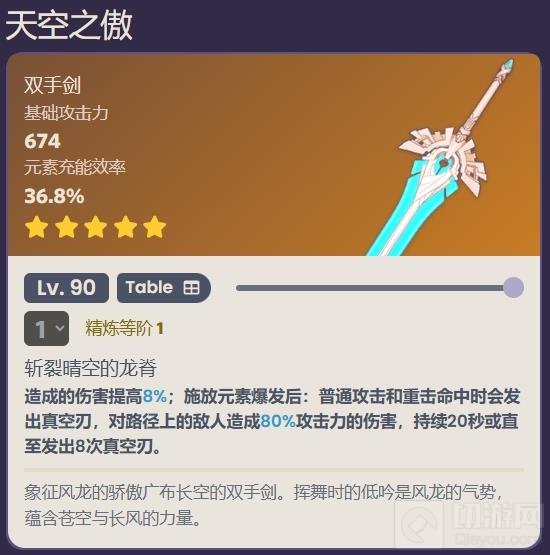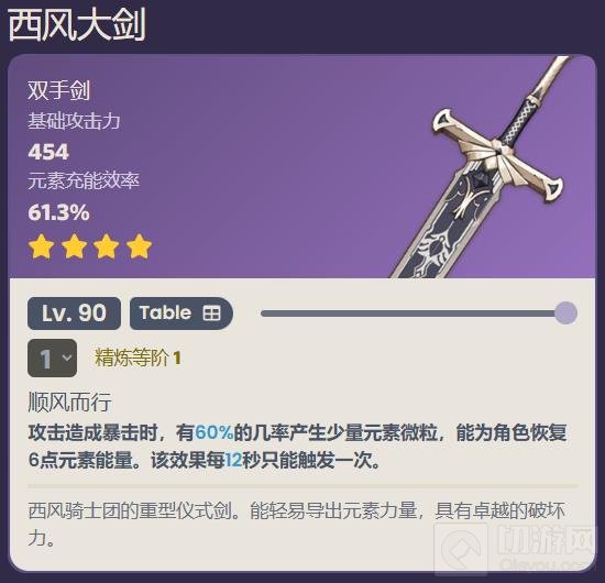 属性:基础攻击力454,副属性提供61.3%元素充能效率,武器特效为会心时生成元素微粒。