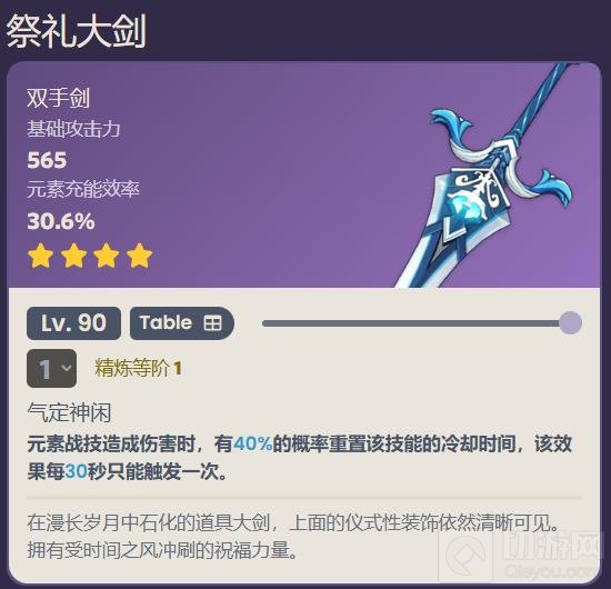 属性:基础攻击力565,副属性提供30.6%元素充能效率,武器特效为元素战技命中时有几率重置冷却时间。