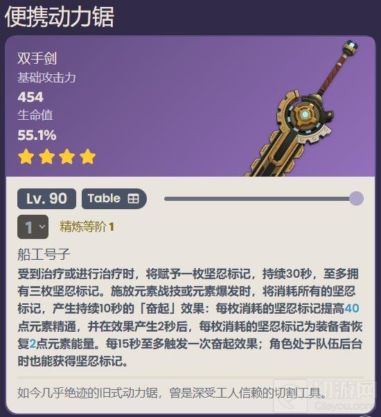 便携动力锯:提供大量生命值加成,同时兼顾元素精通与充能效果,是一个适合辅助角色的武器选择。