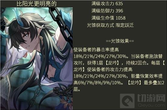 作为五星毕业光锥,"比阳光更明亮的"为丹恒•饮月提供了宝贵的暴击率,这对于他来说至关重要。由于他的终结技需要消耗140能量,这个光锥能有效提升饮月的稳定性,确保能量循环更加顺畅。整体机制需要利用普攻触发,非常契合饮月的战斗风格。