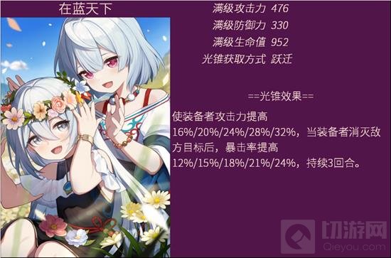 "在蓝天下"是四星中最适合饮月的选择。面对多个小怪的场合,饮月可以轻松秒掉小怪启动在蓝天下的暴击率词条,这对于群体战斗非常有利。