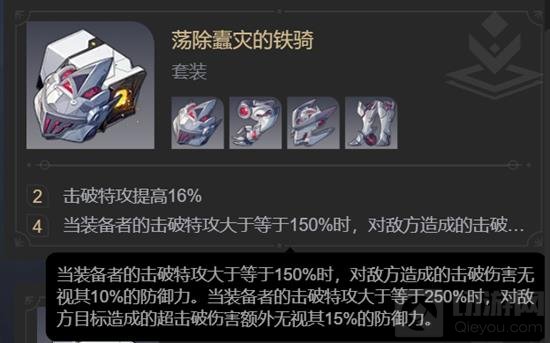 作为击破C的定制套装,铁骑套能够提供直接的击破增益,非常适合乱破这种依赖击破的角色。如果敌人有弱点,铁骑套能够显著增加乱破的输出能力。这个套装提供击破特攻和击破伤害穿防、超击破伤害穿防,其中超击破伤害也可以吃到击破伤害穿防,而击破伤害吃不到超击破伤害穿防。在击破队中的乱破是不错的选择,可以覆盖乱破的主要伤害。