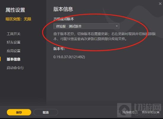 3、选择【属性设置】中的【版本信息】,选择当前应用版本为【体验服】后点击保存完成切换;