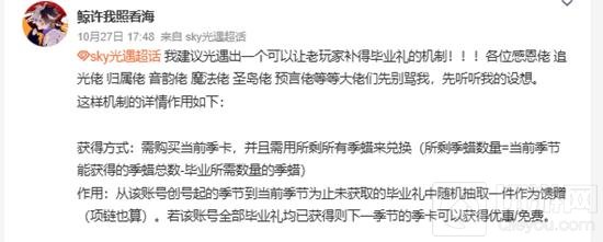 其次因为每个季节算上项链有四个毕业礼,这个机制每次只能随机获得一个,这也不会导致热门的毕业礼烂大街。对于没有完全毕业的老玩家来说,这个机制可以给一个盼头弥补遗憾。对于已经毕业的老玩家来说下一张季卡可以更便宜省下经济,遇到不喜欢的季节不断卡的压力也没这么大。对于新玩家来说完全没什么影响。对于光遇来说,这个机制可以刺激老玩家氪季卡。