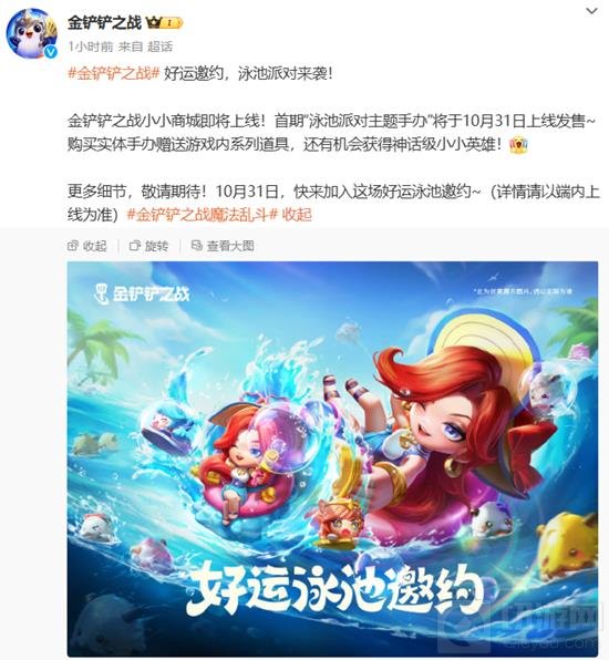 好运邀约,泳池派对来袭!金铲铲之战小小商城即将上线!首期“泳池派对主题手办”将于10月31日上线发售~购买实体手办赠送游戏内系列道具,还有机会获得神话级小小英雄!更多细节,敬请期待!10月31日,快来加入这场好运泳池邀约~