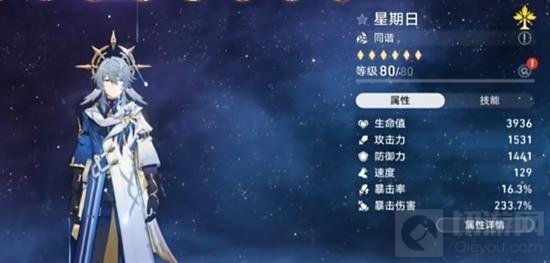 星期日是虚数属性同谐命途角色。星期日的稀有度为五星级,这意味着他拥有极高的成长潜力和强大的技能。星期日的基础速度为96。
