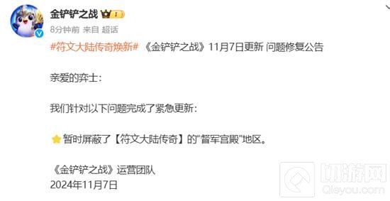 以上就是金铲铲之战紧急更新公告符文大陆传奇督军宫殿地区被屏蔽的全部内容了,更多游戏资讯,攻略,内容敬请关注切游网,您的支持是我们努力的动力!