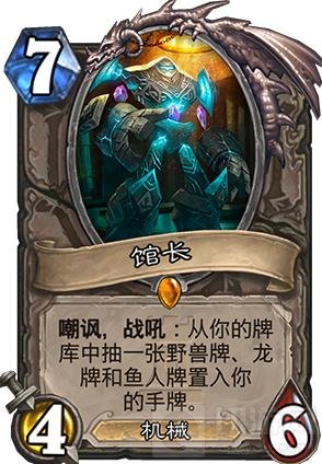 第四张:馆长。这是一张多功能卡。它的作用在于抽卡+站场。这张卡看上去就非常的实用,首先它7费,就能稳定的过3张牌。虽然对抽的牌有限制,但既是它的缺点,又是它的优点,对抽牌性质的限制,却变成了变相的检索。可以对抽的卡加以预测。身材可以对比熊德的546,相当于用2点费用抽了3张卡,它本身还具有机械属性,可以切合一些机械卡组。而野兽、鱼人和龙牌中又有相当多的卡是功能卡,所以实用度非常高。我对这张卡的理解是,这是一张多功能卡。可以适用于很多的控制套牌中。它的缺点在于费用偏高,偏笨拙,会加快疲劳速度,且会增加构筑负担,使你在带上它后不得不再加上龙鱼和野兽,减少了构筑时其他卡的空间,但是综合来说,利还是大于弊,属于实用橙卡之一。