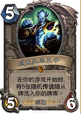 第三张:玛克扎尔王子。这张卡对应每个冒险模式的娱乐卡。如探险者协会的逐星,黑石山的火焰中的管理者。但是这张卡远没有逐星好用。因为经过长期使用我们发现,逐星是一张疲劳卡,之所以逐星好用是因为她可以在中后期放慢疲劳速度,增加中后期的卡组质量。而且在前中期提供一个不卡手的站场。这张卡跟逐星比起来就差了很多。