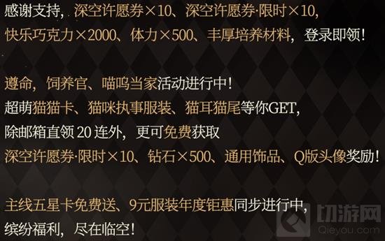 官方发送的福利内容:全服赠礼「深空许愿券*10、深空许愿券·限时*10、快乐巧克力*2000、体力*500、突破晶盒·普通*300、突破晶盒·稀有*100、突破晶盒·珍贵*50、金币*50000、心愿之瓶·稀有*50」