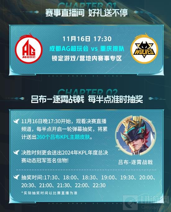 弹幕抽奖:每半点开启一轮,累计送出260个吕布KPL主题皮肤,决胜时刻更有动态冠军签名信物送出。