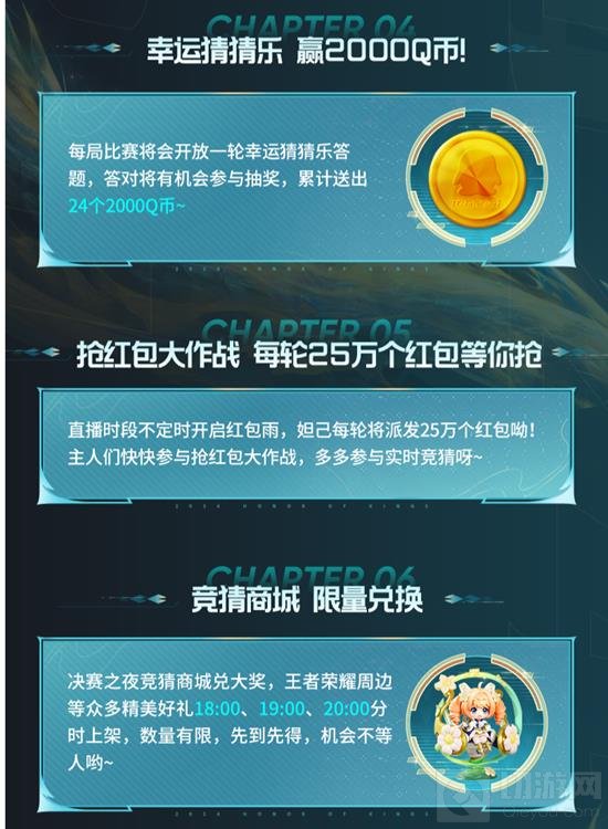 限量兑换:决赛之夜竞猜商城兑大奖,王者荣耀周边等精美好礼限时上架。
