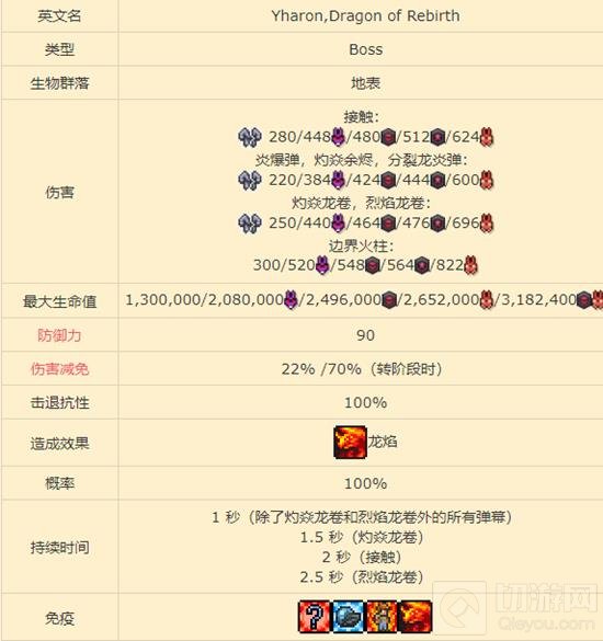 伤害:接触伤害、炎爆弹、灼焱余烬、分裂龙炎弹、灼焱龙卷、烈焰龙卷、边界火柱等不同类型伤害。