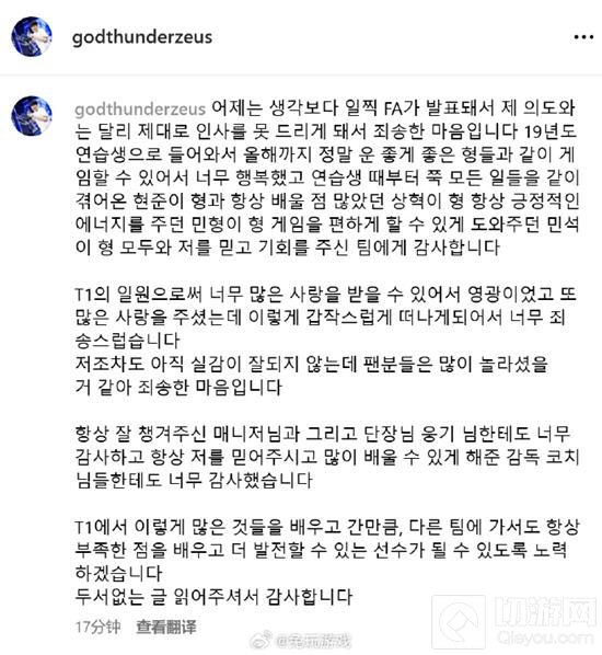 作为T1的一员,我收到了如此多的爱和支持,这让我感到非常荣幸。现在,我不得不以这样意外的方式离开,我内心其实很不好受,但我理解这对于一直支持我的粉丝来说,一定更加震惊和难以接受。对此,我深感抱歉。