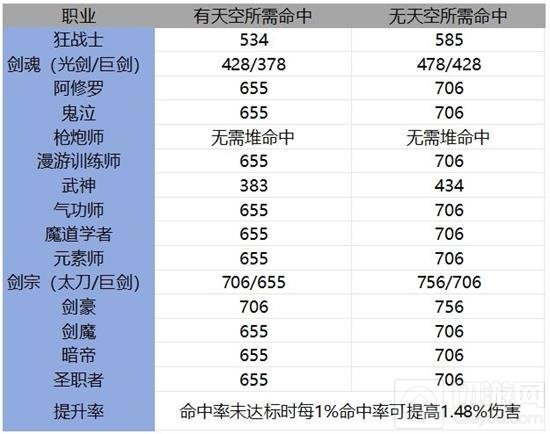 命中率不足会导致技能miss率高,伤害大幅缺失。在未达到当前版本标准的命中率时,应优先提升命中率。以下是当前版本所需的命中率及未达标时每提升1%命中率所带来的伤害提升: