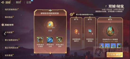 6元解锁双城Ⅱ秘宝,即可领取600点券和双城幻境召唤券,完成累登任务还送双城传说2小小英雄蛋,内含超多系列小小英雄!
