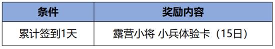 活动奖励:活动期间,玩家完成累计签到一天即可领取小兵体验卡。