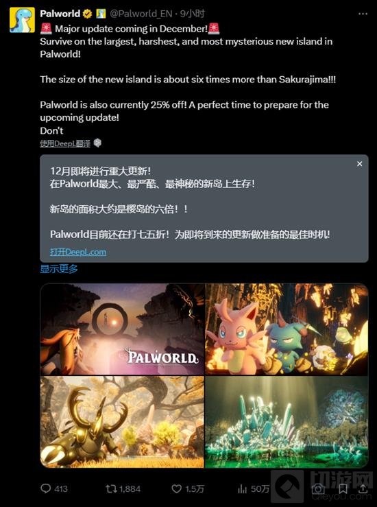 《幻兽帕鲁》官方今日通过社交媒体宣布,将于12月推出规模空前的更新,为冒险者带来更广阔的探索空间和更高难度的挑战。这次更新的亮点是一座“比夏季推出的樱岛还要大6倍”的全新岛屿,配以凶猛的新生物和强大的高塔BOSS。