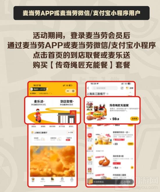 活动期间,登录麦当劳会员后通过麦当劳APP或麦当劳微信/支付宝小程序点击首页的到店取餐或麦乐送购买【传奇绳匠充能餐】套餐。