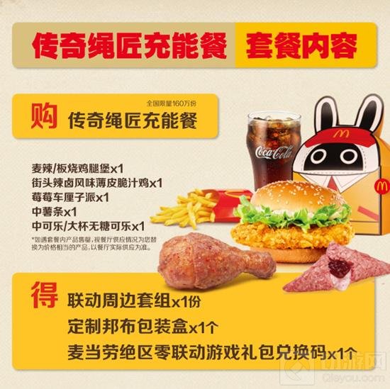 购全团限量160万份传奇绳匠充能餐,得联动周边套组x1份,定制邦布包装盒x1个,麦当劳绝区零联动游戏礼包兑换码x1个,联动周边每周10:45上新。