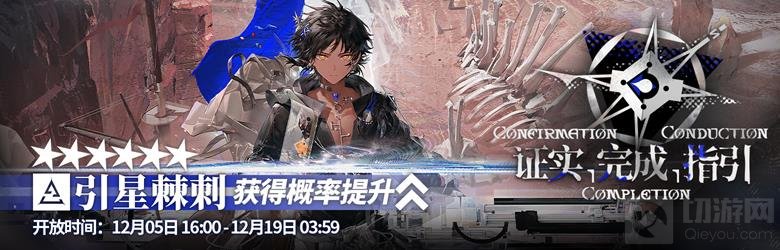 12月05日16:00至12月19日03:59,【证实,完成,指引】限时寻访将开启,其中六星干员【引星棘刺】和五星干员【特克诺/杏仁】获得概率提升。异格棘刺在这次寻访中有151抽必出的保底机制。
