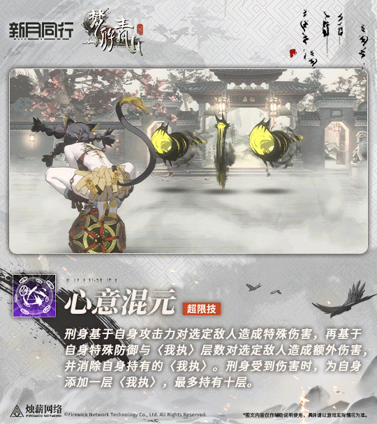 刑身基于自身攻击力对选定敌人造成特殊伤害,再基于自身特殊防御与【我执】层数对选定敌人造成额外伤害,并消除自身持有的【我执】。刑身受到伤害时,为自身添加一层【我执】,最多持有十层。此技能是刑身的核心输出技能,可以在战斗中造成大量伤害。合理利用【我执】层数,可以在关键时刻爆发高额伤害。