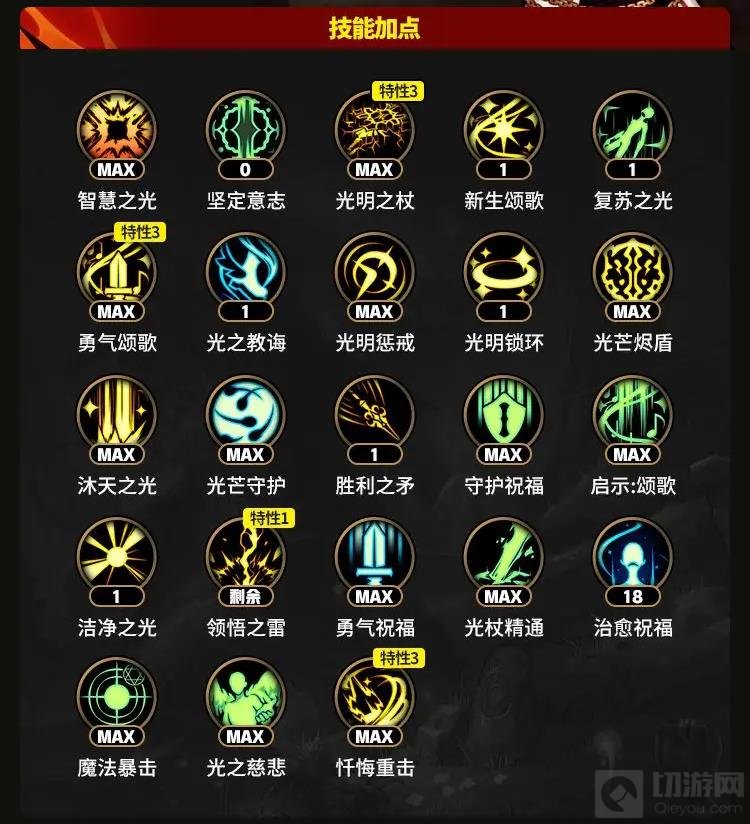 技能加点方面,坚定意志可以不用开,新生颂歌、光明锁环、光之教诲、复苏之光、胜利之矛、洁净之光都是可以只开了保留1级。