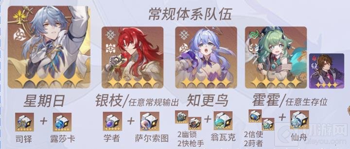 在常规体系队伍中,星期日可以与银枝(或任意常规输出角色)、知更鸟和霍霍(或任意生存位角色)搭配。具体配置如下: