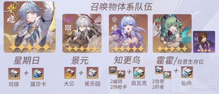 在召唤物体系队伍中,星期日可以与景元、知更鸟和霍霍(或任意生存位角色)搭配。具体配置如下: