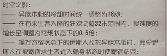 异族本相:冷却时间统一调整为18秒。在求生者入座的狂欢之椅32米范围内,侵蚀度增长速度调整为常规状态下的0.5倍。操控寄宿状态下的伊斯人长按异族本相时,会令伊斯人在被寄宿求生者进入隐身状态时使寄宿结束。
